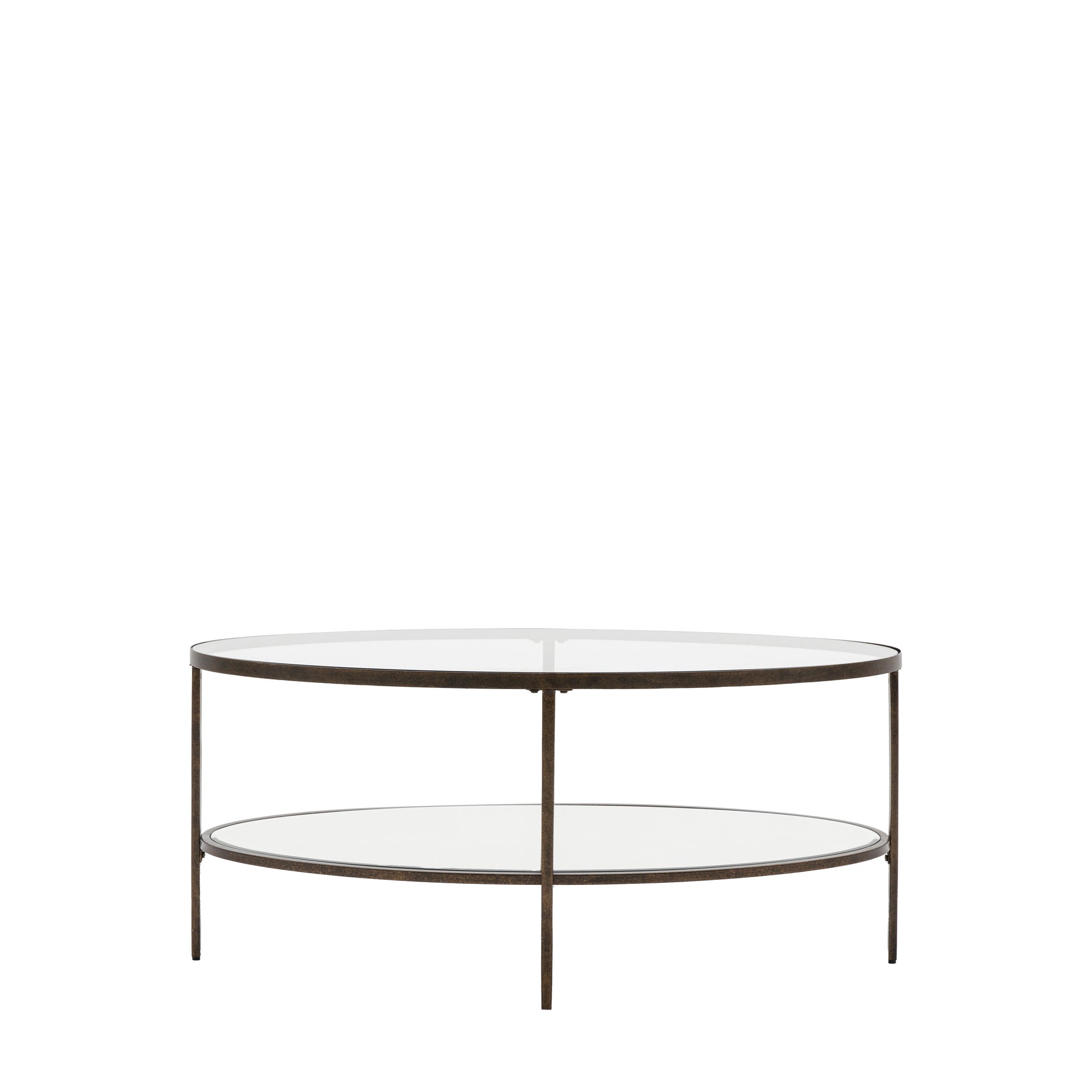 A stunning oval metal coffee table featuring an aged bronze finish, an inlaid tempered glass top, and a bevelled mirrored shelf for added sophistication. This beautifully designed piece blends classic elegance with modern refinement, making it a statement addition to any living space.